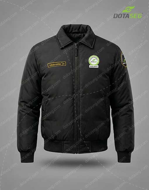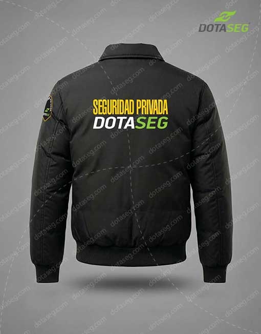 Chaquetas Dotación para Vigilancia y Seguridad Privada Bogotá, impermeable enguatada, 2 bolsillos delanteros, 1 bolsillo interno, ojaletes porta placa, bordado en espalda, letras amarillas. (Opcional: placa bordada frente izquierdo y escudo bordado manga izquierda).